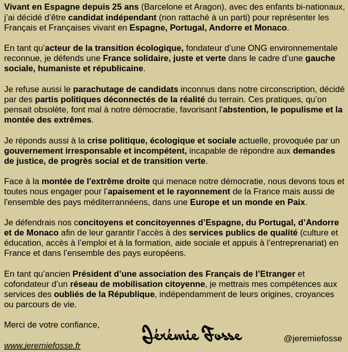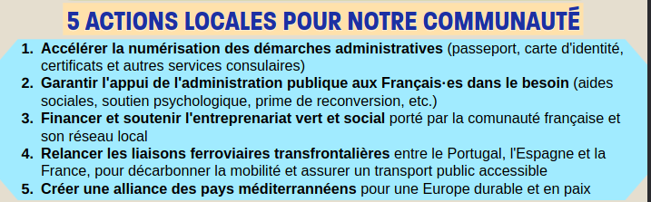 Vivant en Espagne depuis 25 ans et acteur de la transition sociale et écologique, je défends une France et une Europe solidaire, juste et verte.
